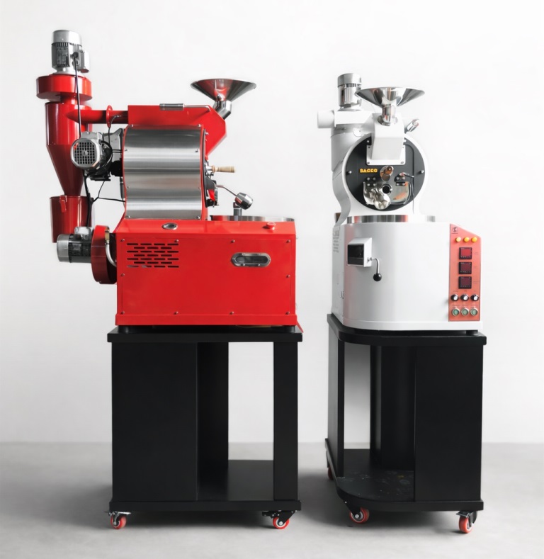 Thân máy làm bằng thép sơn tĩnh điện, phần tiếp xúc với cà phê thành phẩm bằng inox SUS304, trống rang bằng ống thép chịu nhiệt chuyên dụng